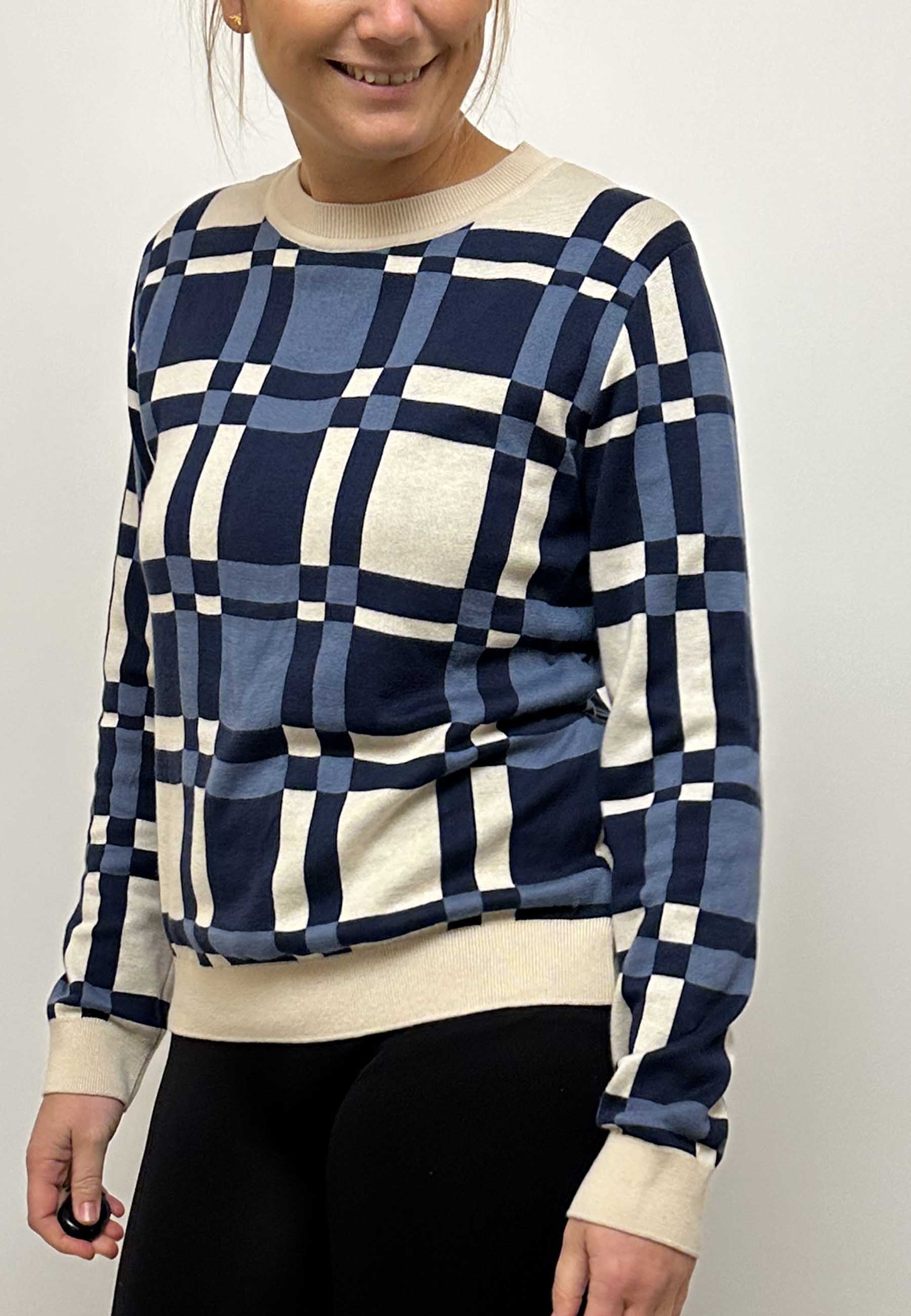 Det smukke grafiske mønster af tern gør blusene legende. Farverne er holdt i blå nuancer, der passer godt ind i de fleste garderober.