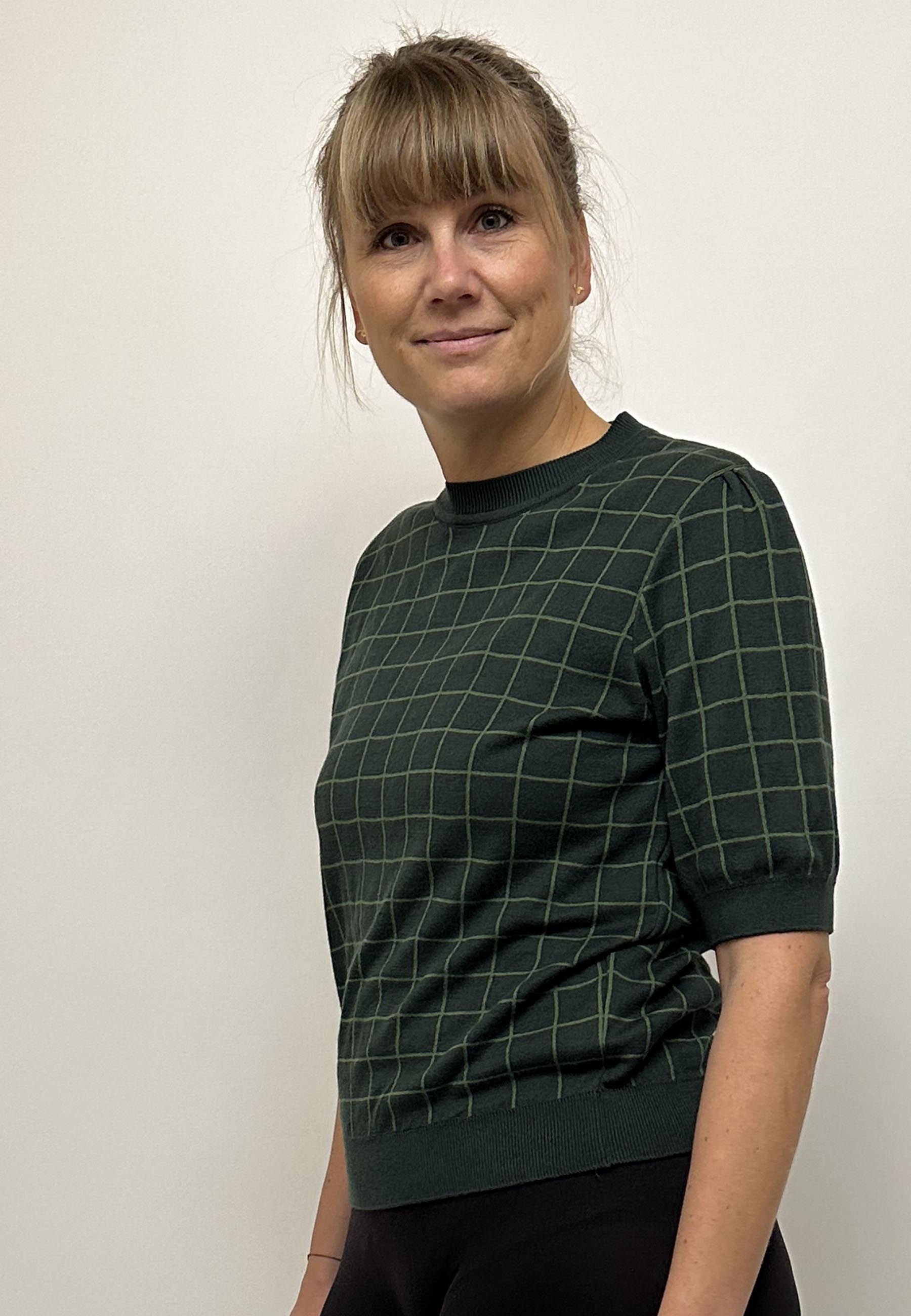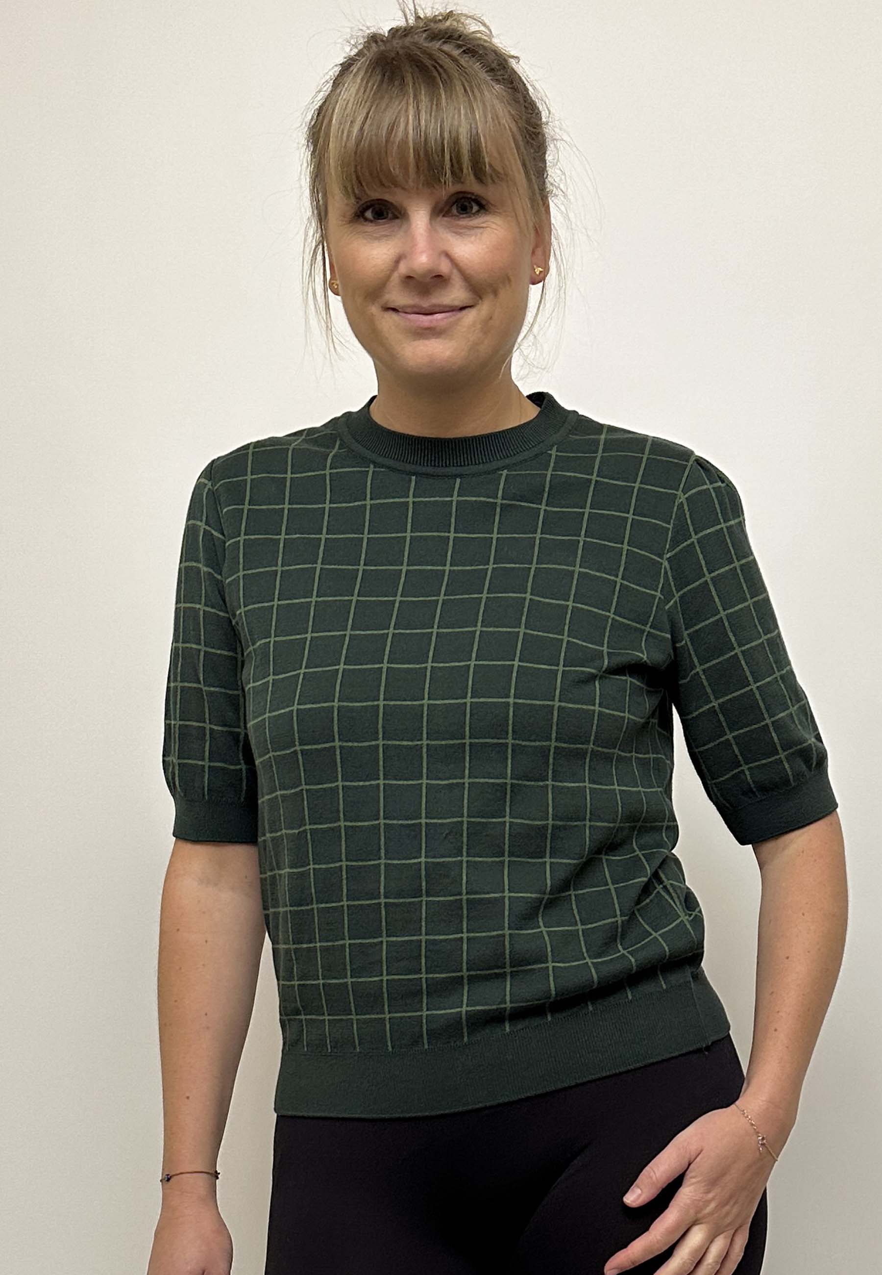 Blusen er strikket i en lækker tyk bomuldskvalitet, der føles blød og naturlig på kroppen. Det grafiske mønster er ternet grøn med en mørk farve og en lys stribe – klassisk og legende på samme tid.