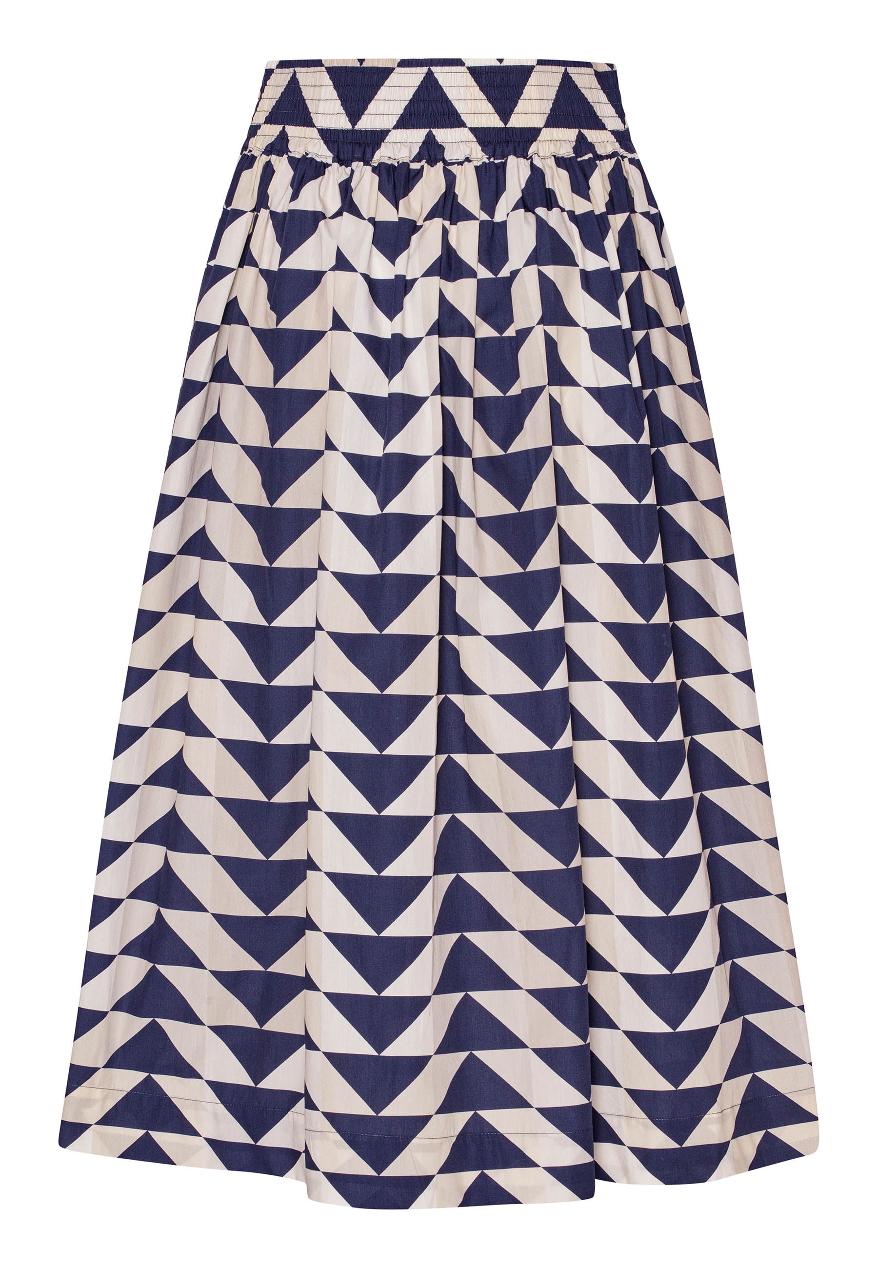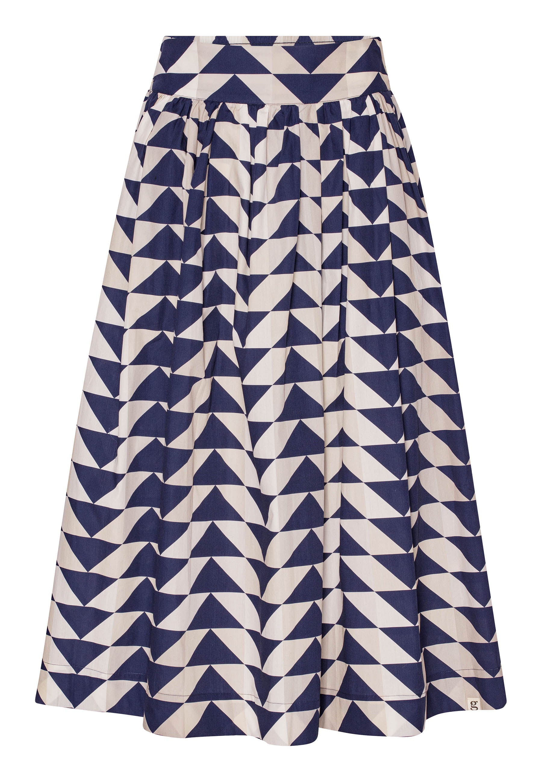 Nederdelen er syet i økologisk vævet bomuldspoplin med en let og sprød kvalitet, der giver et smukt fald og et elegant, enkelt udtryk. Det grafiske print i blå nuancer tilfører et roligt spil og karakter, samtidig med at det understøtter nederdelens feminine snit.