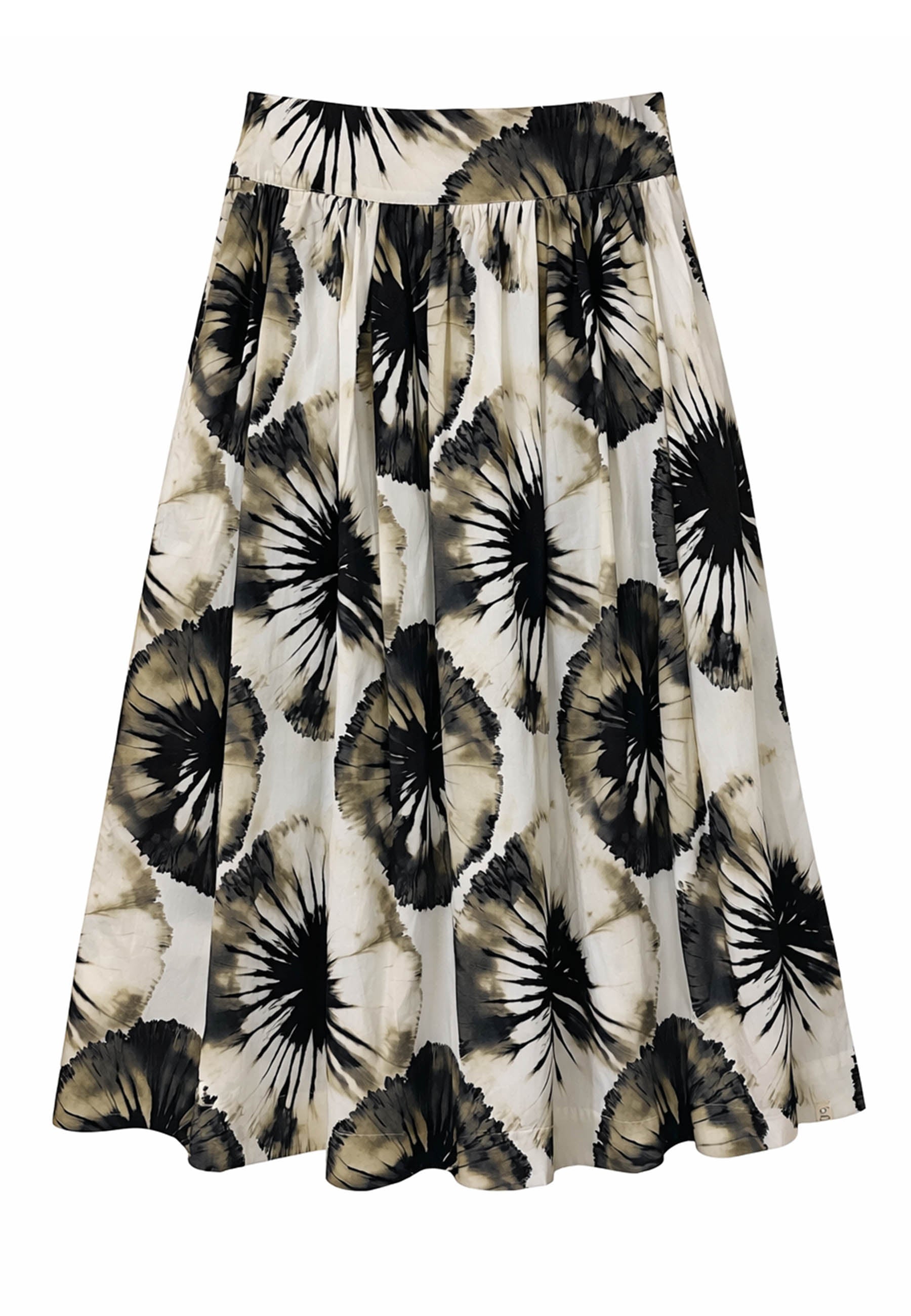 Nederdelen er syet i økologisk vævet bomuldspoplin med en let og sprød kvalitet. Stoffet giver et smukt fald og et rent, elegant udtryk. Det grafiske print i jordnære nuancer tilfører karakter og dybde, samtidig med at det understreger nederdelens feminine silhuet.